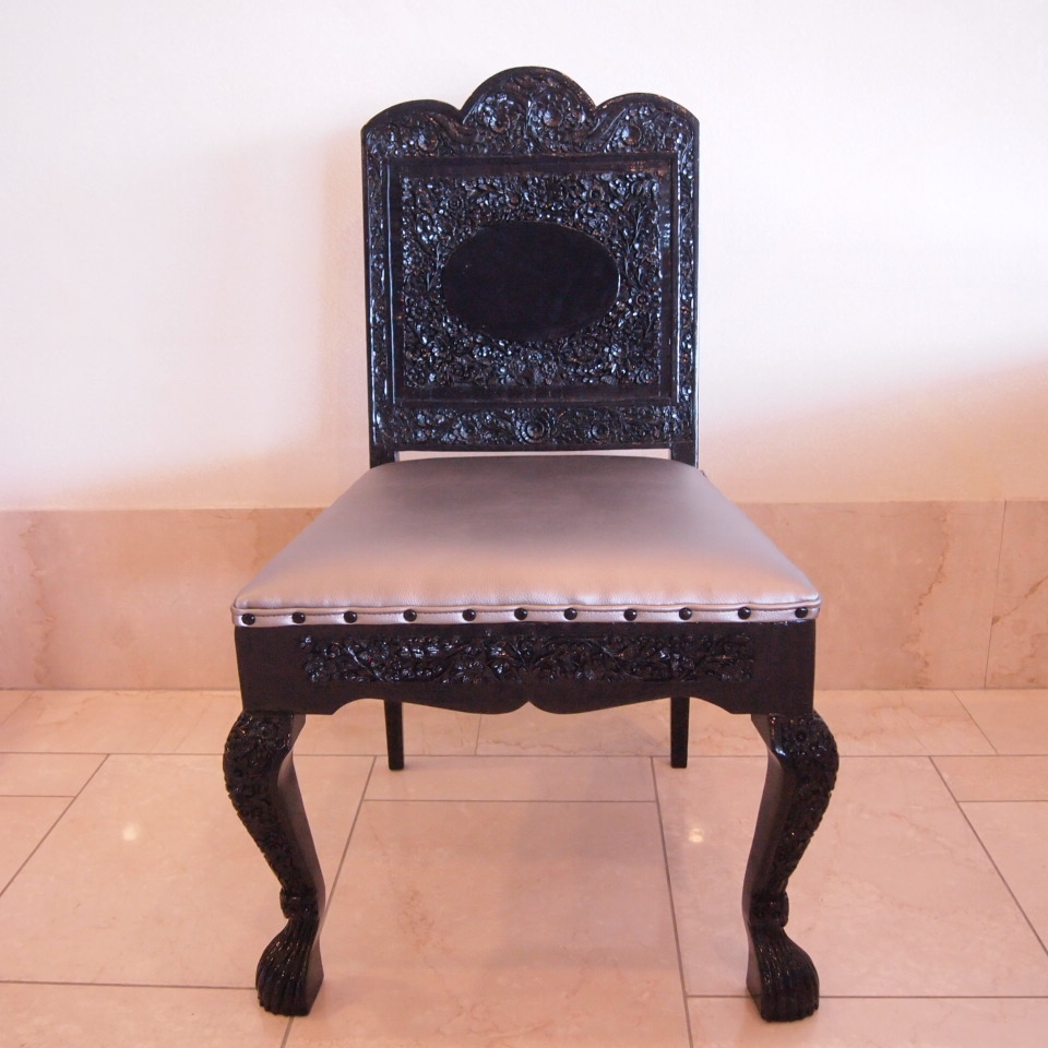 ホテルレストランで使用されていた高級木製椅子です。当社工房で、生地張替え・塗装を施し素敵に生まれ変わりました。ショップのディスプレイにおススメ。